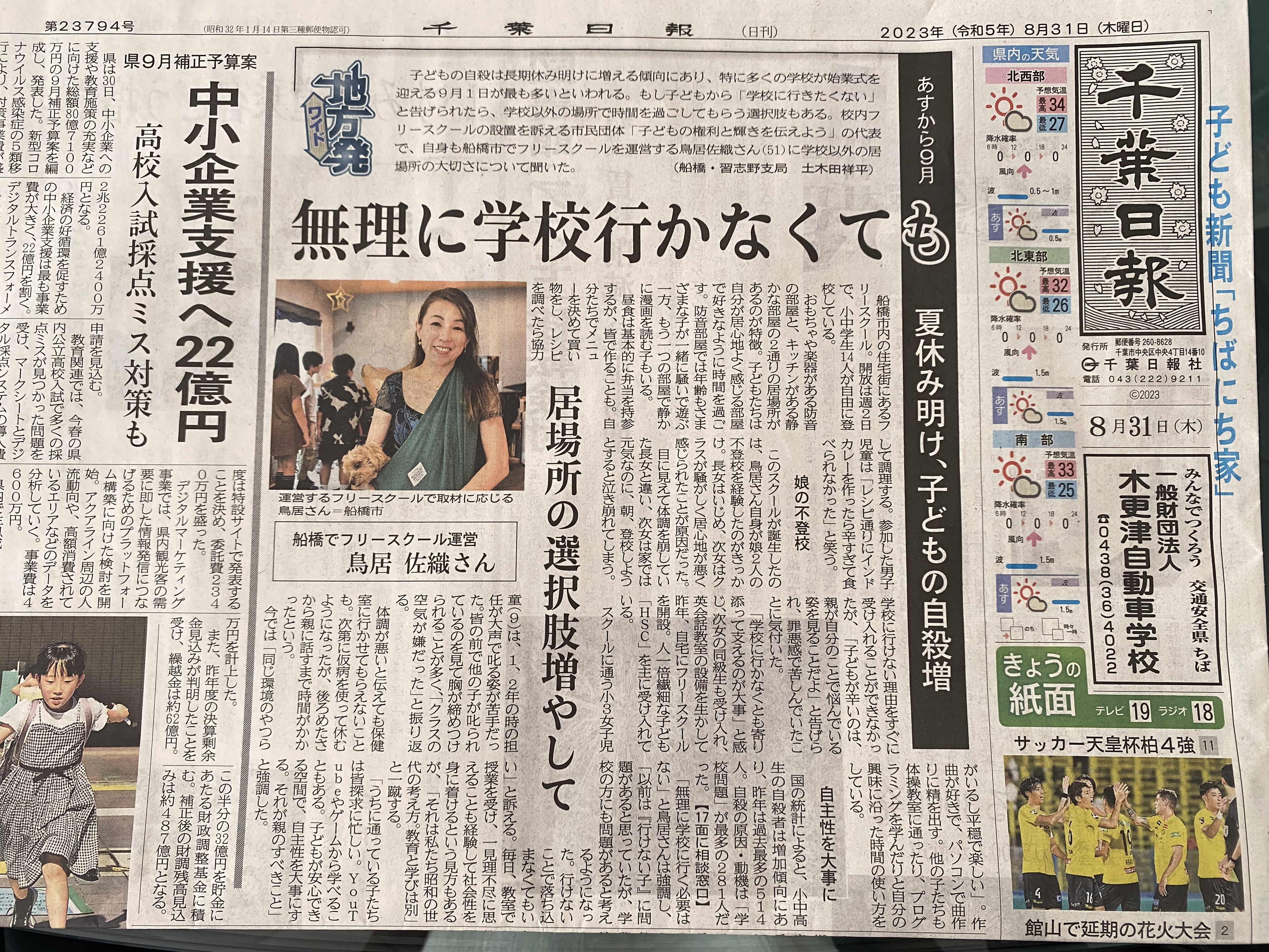 🔷無理に学校行かなくていいよ千葉日報2023年8月31日🌟子どもたちへ、親でも先生でもない、自分の心を信じてね!