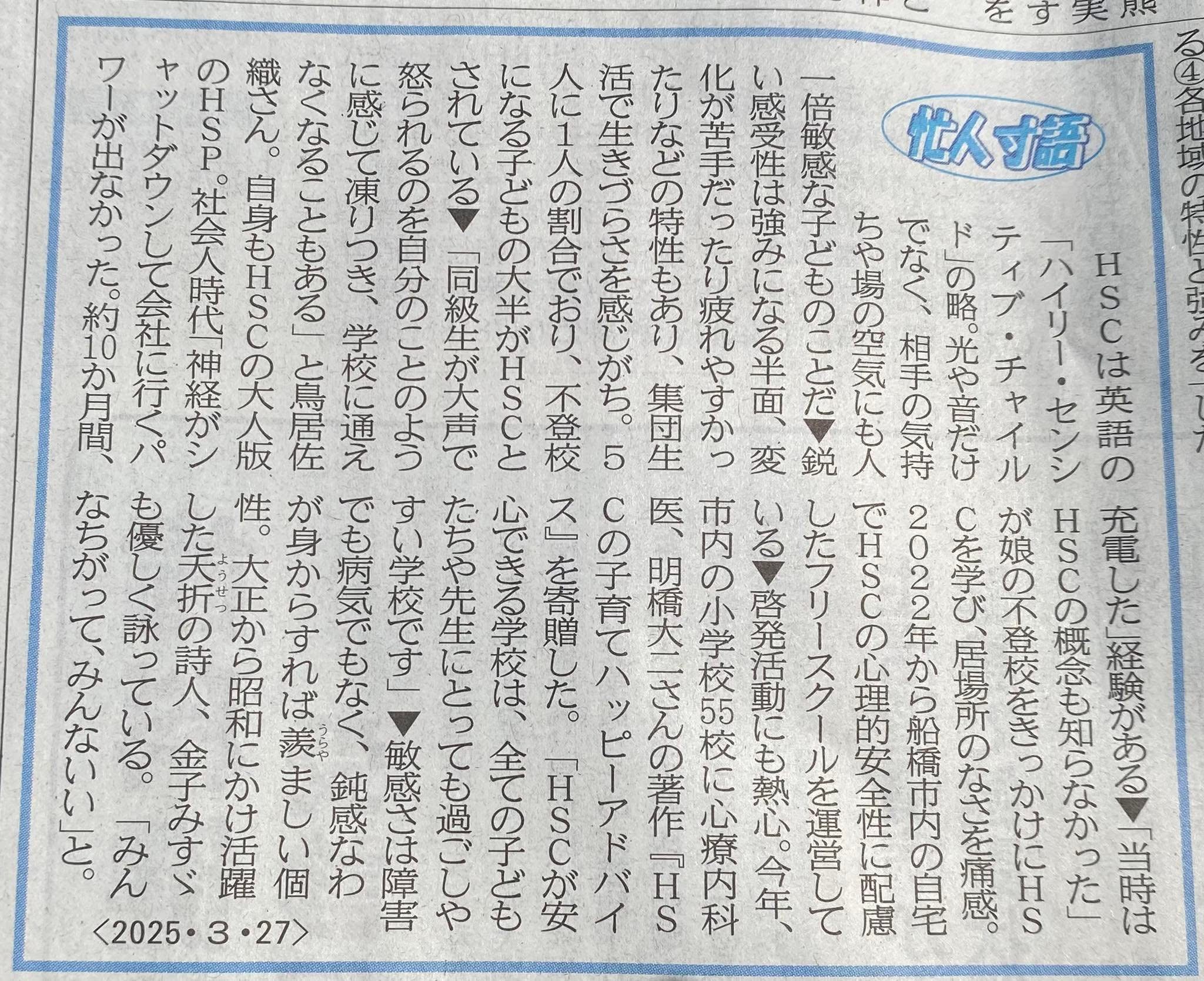 🔹『HSCの子育てハッピーアドバイス』本を船橋市の公立小学校55校に寄付 (千葉日報 2025年3月27日)chibanippo.co.jp/boujin/1418959