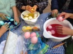 教室のイースターパーティーには小さなお子さんがたくさん来ますので、食紅(food coloring)を使用しました。庭先で作業して少し寒かったけれどみんなで頑張りました。