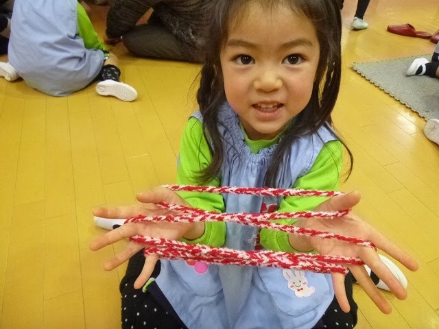 小3 Kちゃんが「何か紙で作ったもの」(Something made out of paper)とお題を出すと、ある子が手作りの節分のお面をかぶってきました。カナちゃんも鬼役をやって豆を投げられたことがあるよと話してくれました。