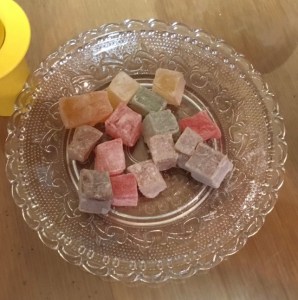 ターキッシュ・デライトを3年ほど前にロンドンのデパートでお土産に買い、自宅の英会話スクールの子どもたちとナルニア国物語を読んだ後に食べたことがあります。ギリシャのお土産に薔薇フレイバーのものもいただいたことがあります。日本のお菓子でいうと、ボンタン飴の香りと甘さをもっと強烈にした感じ。