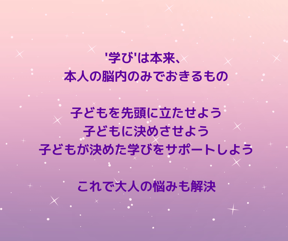 本来学びは本人の脳内のみで起こるものです。子どもが選択し、自由に豊かな学びを得る時代になりつつあります。悩む親御さんに気づいてほしいです。