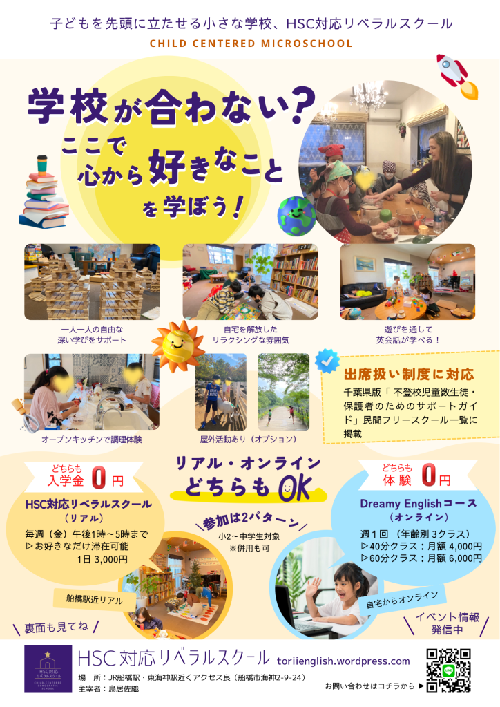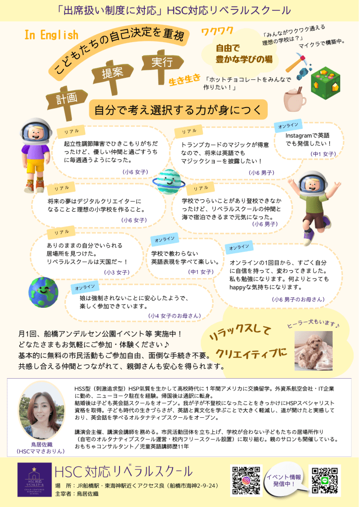 正直言いますと、最初はHSPである私にとっても今の高敏感なHSCの感覚には驚きました。しかし、子どものものの感じ方を受け入れるのが大事と気づき、HSC対応と特色を出してリベラルスクールを運営しています。