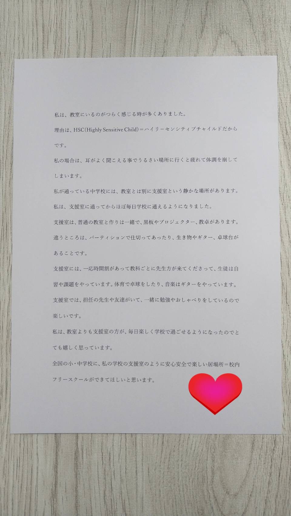 今現在学校に行きたくても行けずに困っている子だけでなく、仮面登校の子のための選択肢として、校内フリースクールが全小中学校に設置されることを強く望み、みんなで活動を続けていきたいと思います。