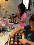 今回は私が英語で指示し、娘たちだけで材料を測り、混ぜて、カップケーキを焼き、アイシング作りにトライ!