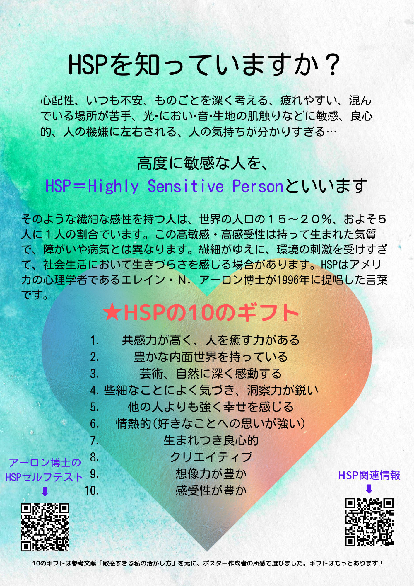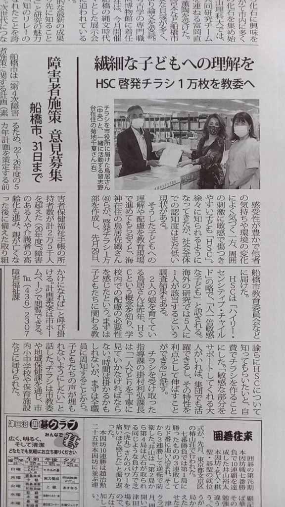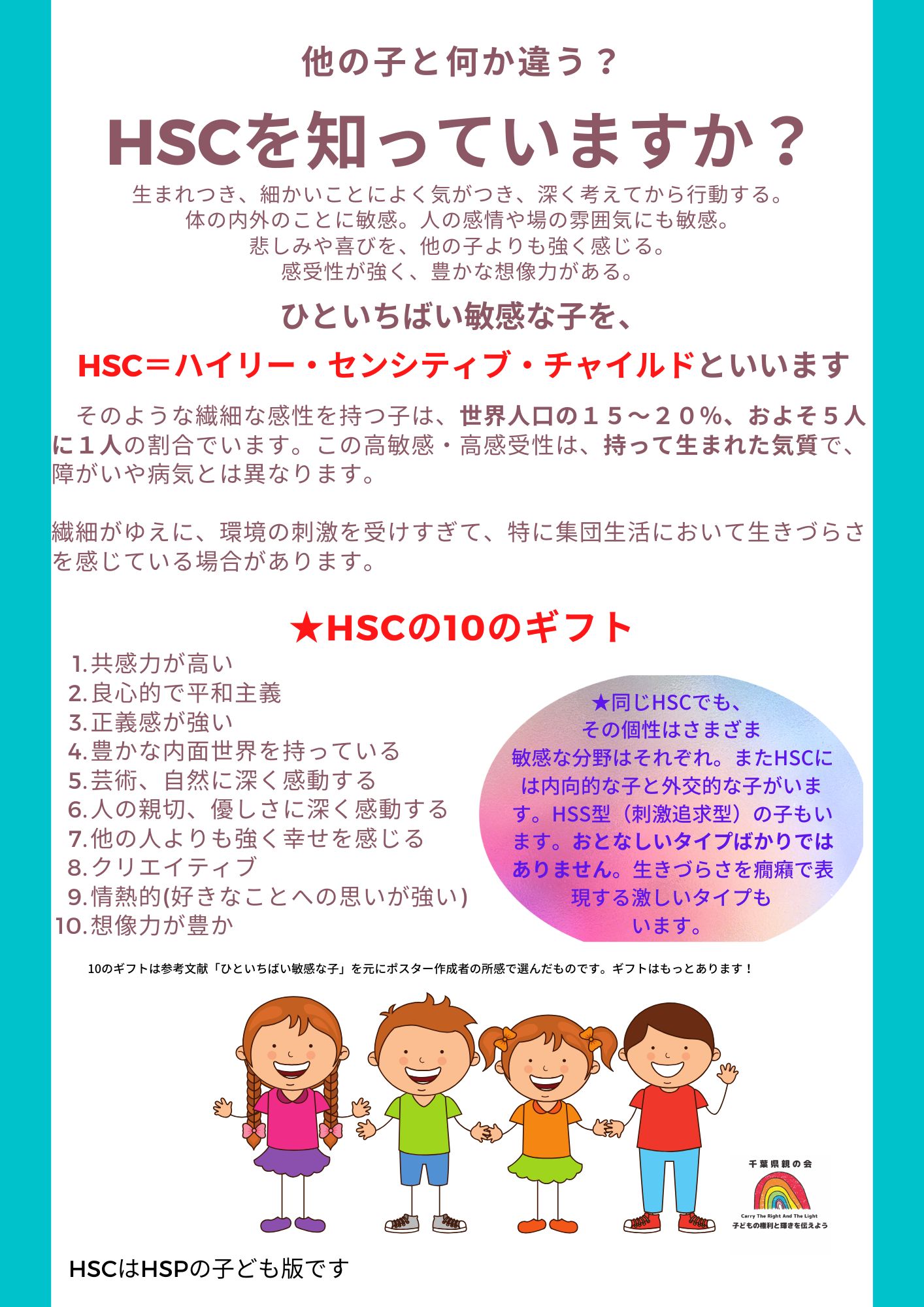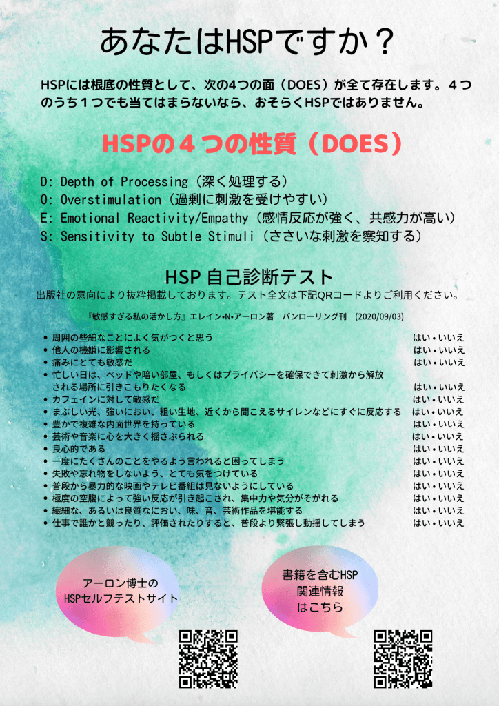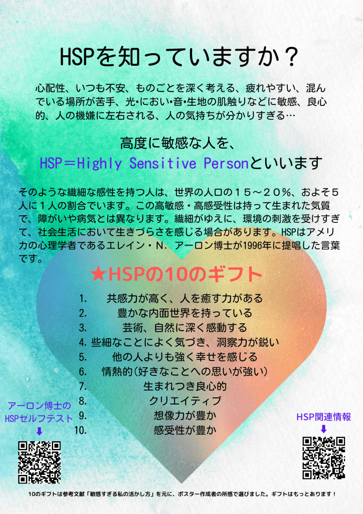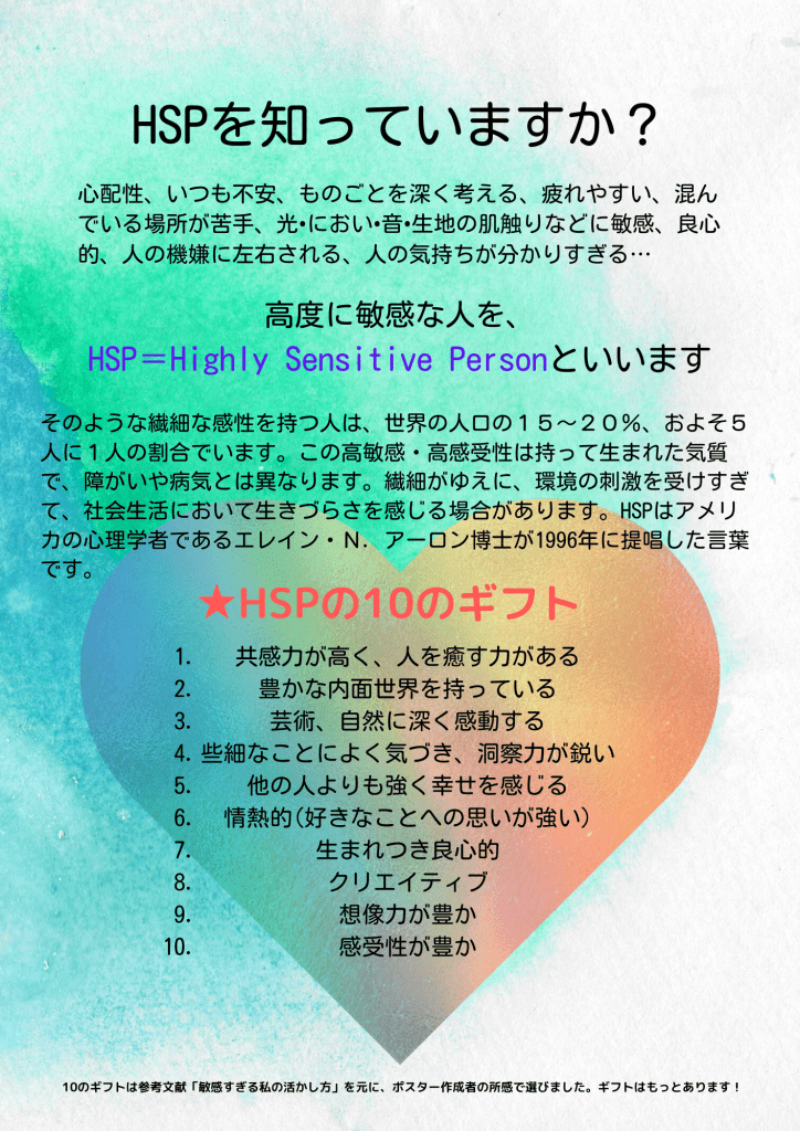 こちらのHSC啓発ポスターは2022年、船橋市教育委員会経由で市内小中学校の全教職員2700名に配布されました。(※エレイン・アーロン博士の代理人と出版社に著作権上の確認済み。